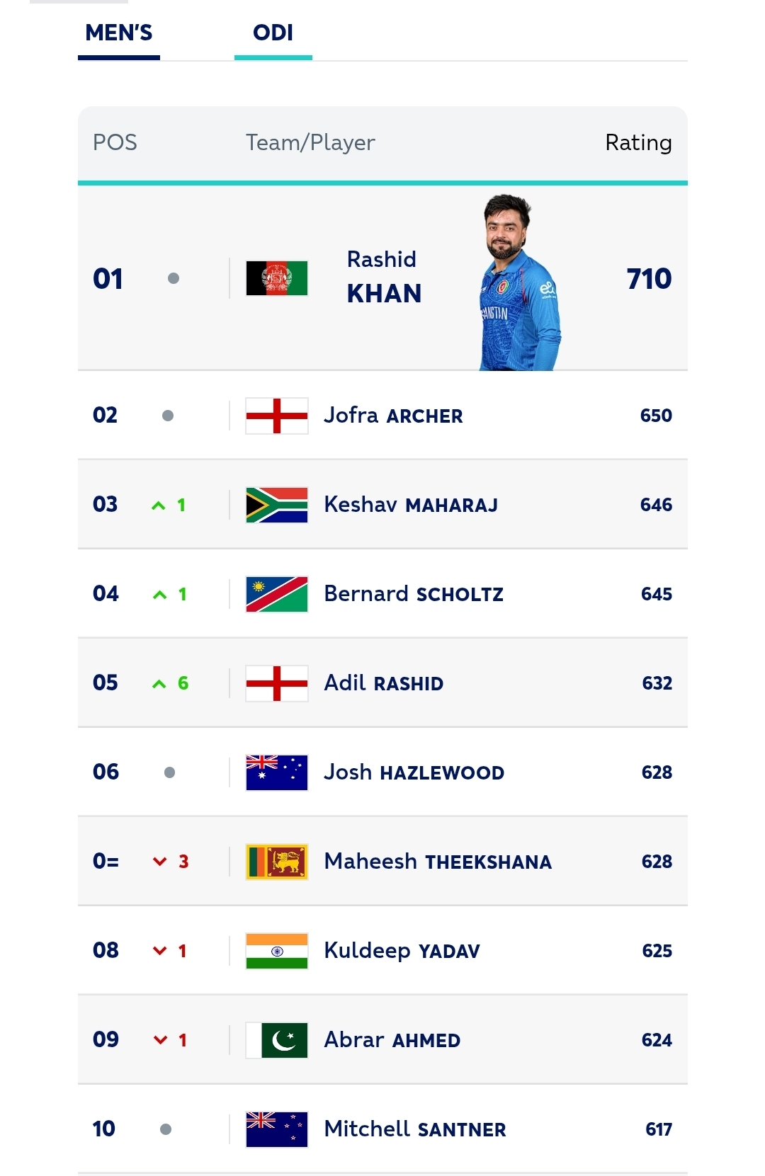 In the ODI bowling rankings, leg-spinner Adil Rashid has moved up six places to fifth with seven wickets in the series and Sri Lanka’s left-arm spinner Dunith Wellalage has progressed from 43rd to 29th. (Newswire)