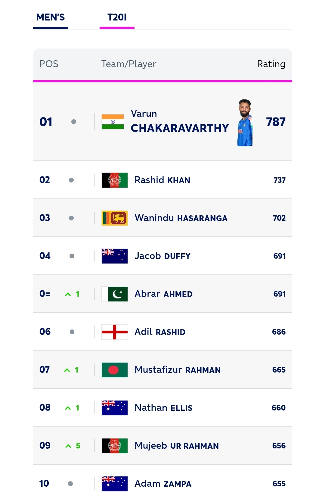 In the T20I bowling rankings, Afghanistan spinner Mujeeb ur Rahman’s haul of four for 21 in the second match against the West Indies sees him gain five places and reach ninth position, while India’s Jasprit Bumrah (up four places to 13th) and Ravi Bishnoi (up 13 places to 19th) have progressed along with South Africa’s Corbin Bosch (up eight places to a career-best 32nd).