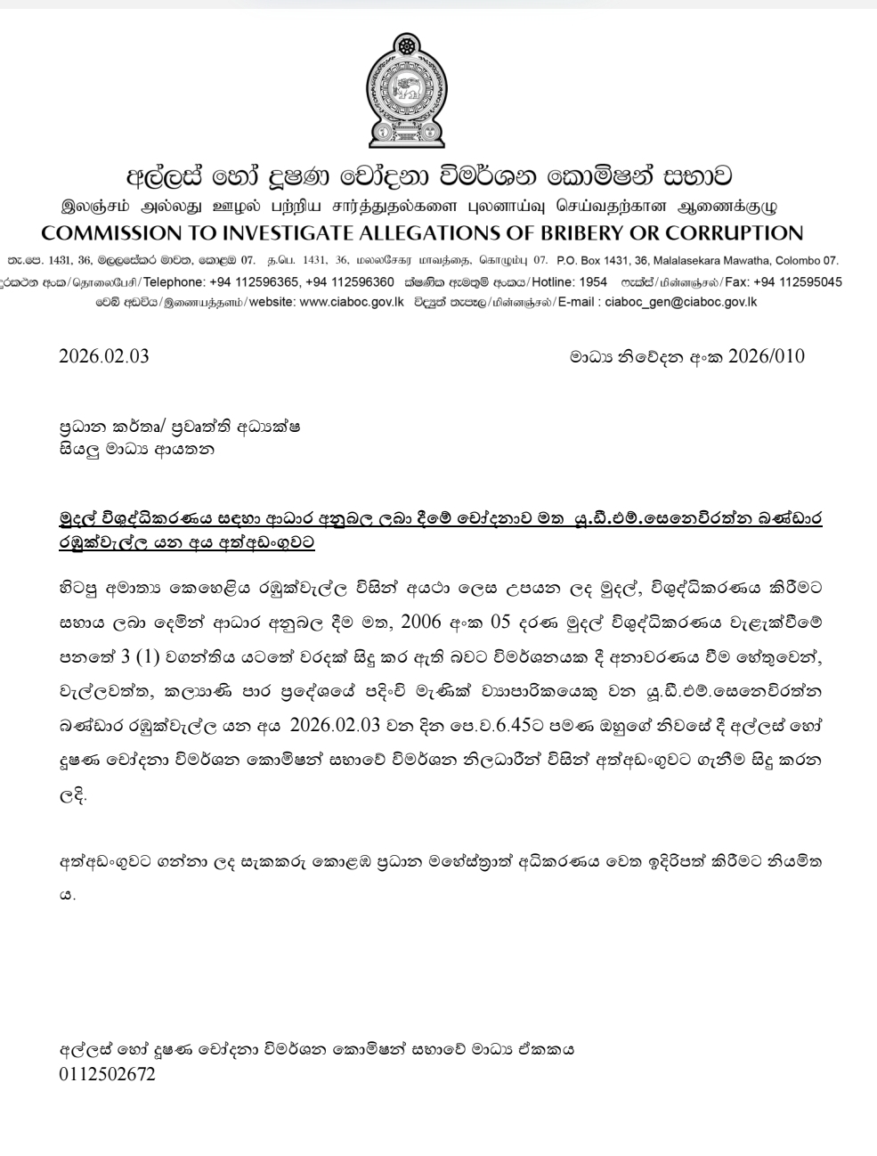 Bandara Rambukwella, a cousin of former Minister Keheliya Rambukwella, has been arrested this morning (Feb. 3) at his residence on allegations of money laundering, according to Police.