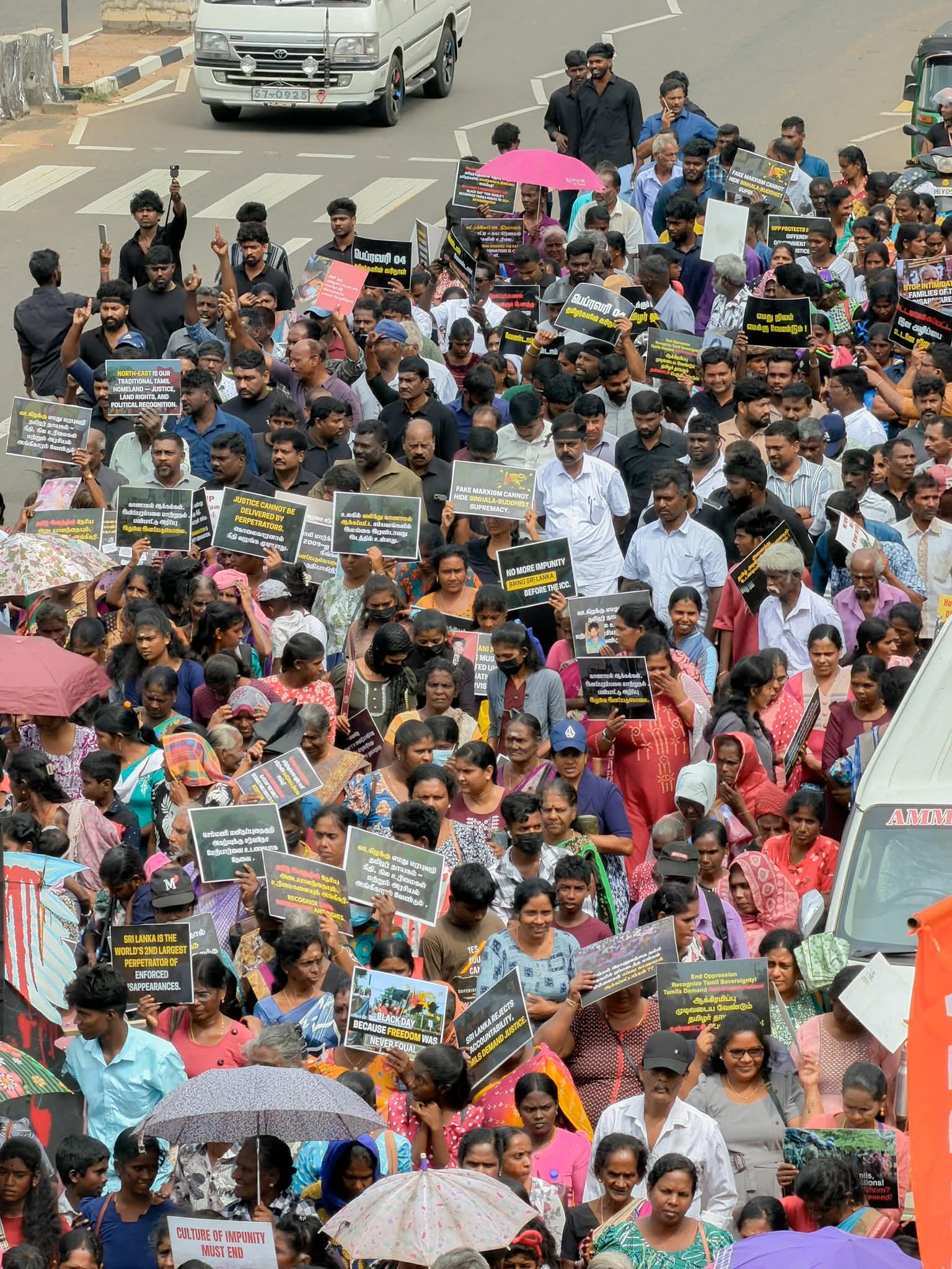 Participants carried placards and chanted slogans including “The North and East are the Tamil homeland,” “We demand an international investigation,” and “Sri Lanka’s Independence Day is a Black Day for Tamils.”