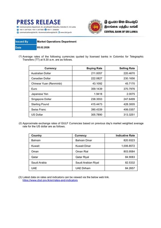 The Sri Lankan Rupee has appreciated against the US Dollar today (Feb 5), compared to Tuesday.