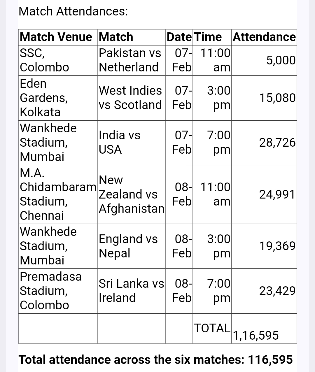 India’s victory over the USA at Mumbai’s Wankhede Stadium saw the highest attendance over the weekend with 24,997, with four of the five other matches seeing more than 15,000 people through the gates.