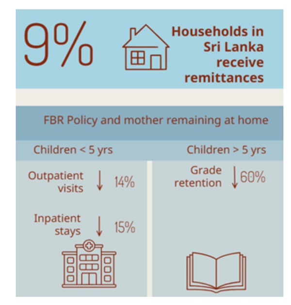 Although around 9% of households in Sri Lanka receive remittances from abroad, this study, based on data from three waves (2009/10, 2012/13 and 2016) of the Household Income and Expenditure Survey (HIES) finds that the mothers’ presence at home, arising from the Family Background Report (FBR) restriction, contributes to better health and educational outcomes for children. Adherence to this restrictive migration policy reduces outpatient visits for illness among children under 5 years of age by 14% and inpatient stays by 15.2%, relative to similar children whose mothers are not at home.