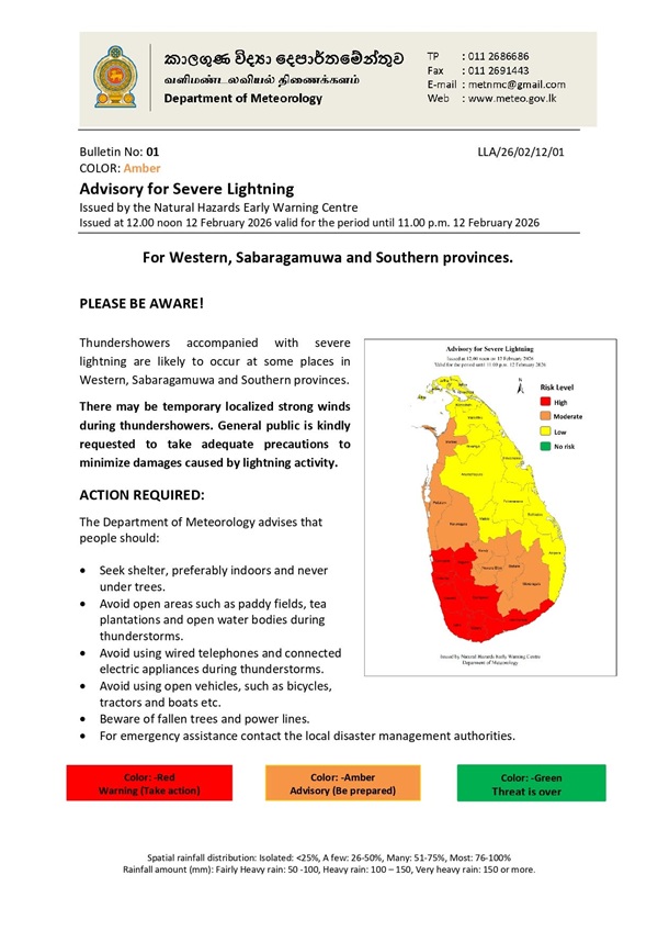 The Department of Meteorology has issued an advisory for severe lightning in the Western, Sabragamuwa, and Southern Provinces today.