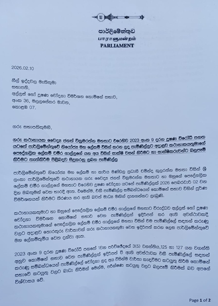 In his letter, Rajakaruna highlights that a complaint was lodged on February 2, 2026, by Parliament’s Deputy Secretary General Chaminda Kularatne, accusing the Speaker and his secretary under the Anti-Corruption Act No. 9 of 2023.