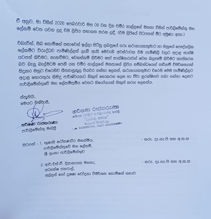 Opposition MP Harshana Rajakaruna has written to Neil Iddawala, Chairman of the Commission to Investigate Allegations of Bribery or Corruption (CIABOC), calling for urgent action over alleged attempts to interfere with evidence in a corruption complaint against Speaker Jagath Wickramaratne and his private secretary Chameera Gallage.