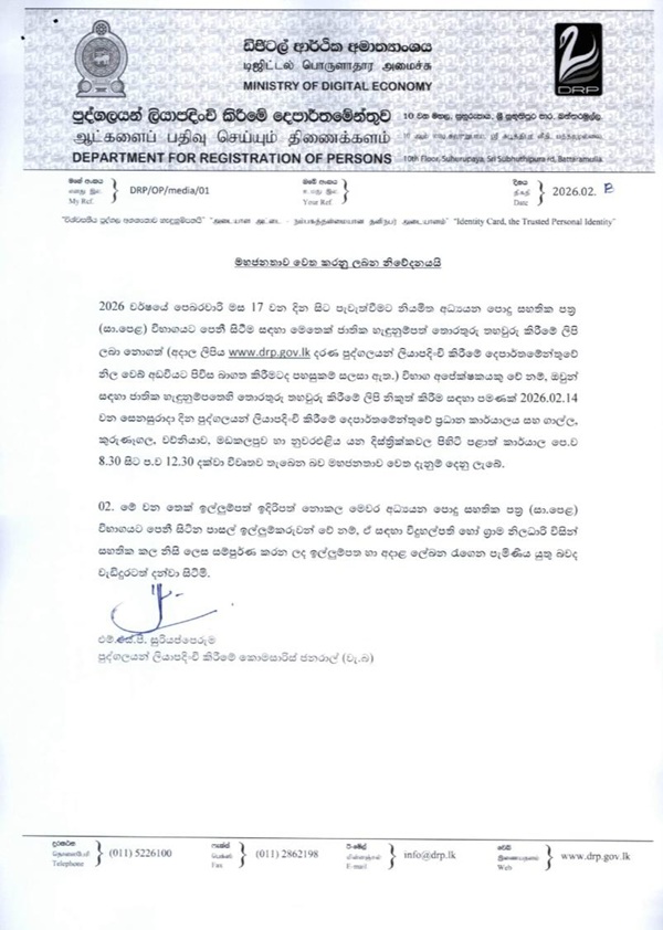 The Department has announced that its head office and provincial offices in Galle, Kurunegala, Vavuniya, Batticaloa, and Nuwara Eliya will remain open on Saturday (14 Feb) from 8:30 am to 12:30 pm for the sole purpose of issuing letters confirming NIC information for candidates sitting the G.C.E. Ordinary Level Examination beginning on 17 February.