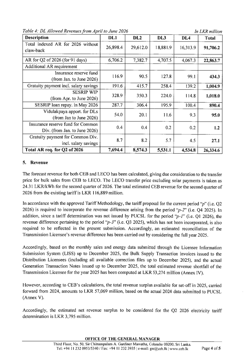 The Ceylon Electricity Board (CEB) has proposed a 13.56% increase in electricity tariffs for the second quarter of 2026, citing an estimated revenue deficit of Rs. 15.8 billion from April to June.