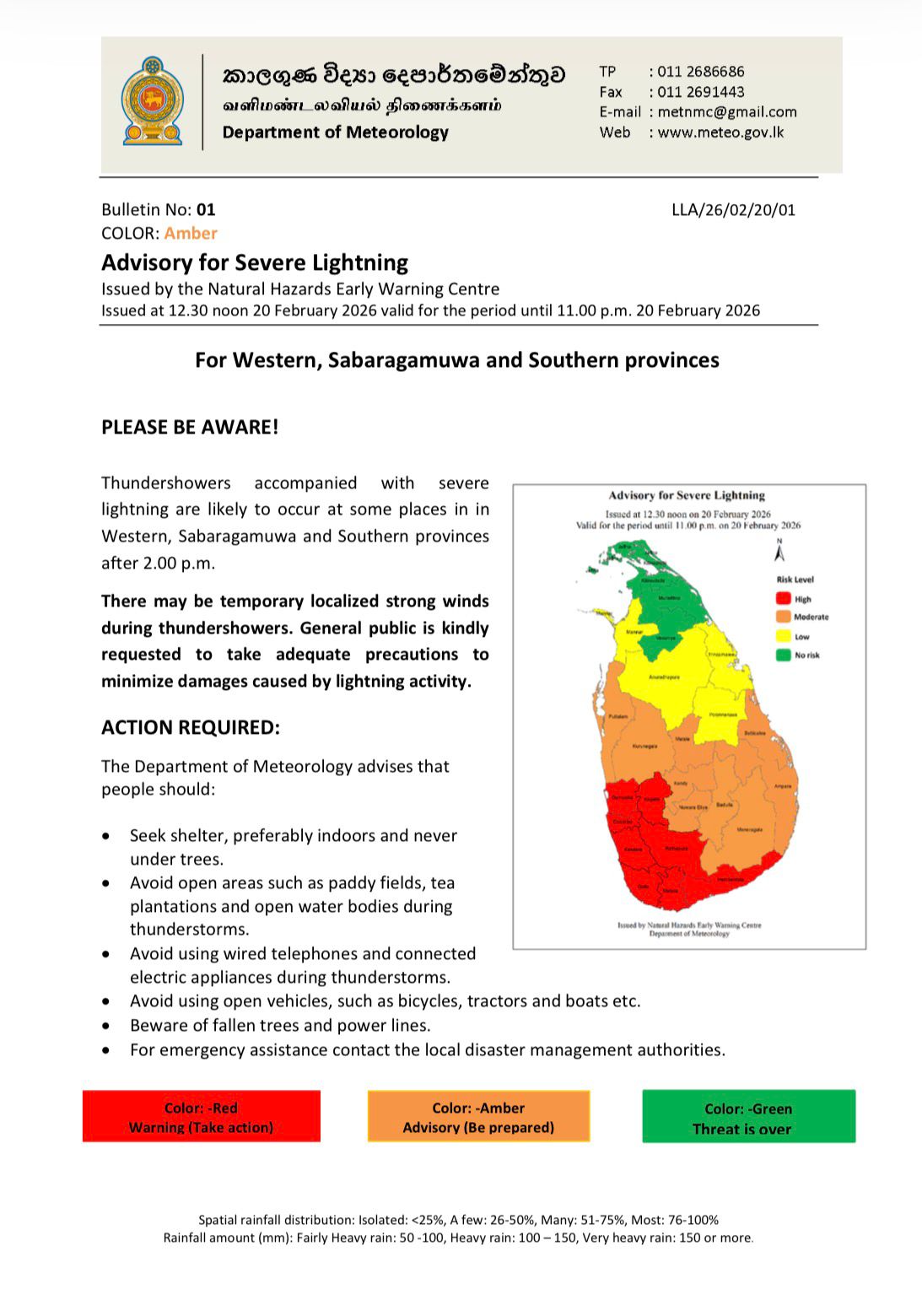 The Department of Meteorology has warned that thundershowers accompanied by severe lightning are likely to occur at several places in the Western, Sabaragamuwa and Southern provinces after 2 p.m.