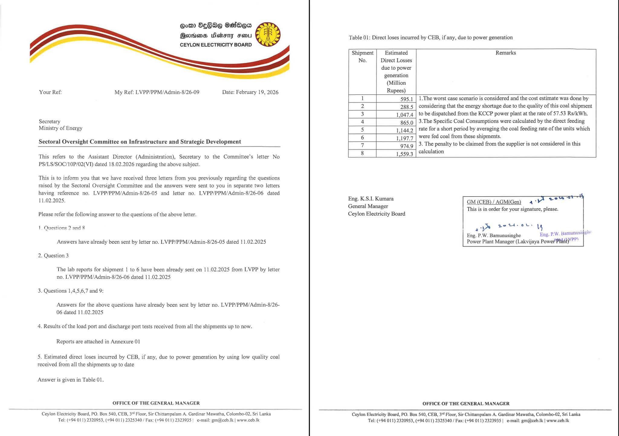 Ranawaka referred to a letter dated February 19 sent by CEB General Manager K.S.I. Kumara to the Parliamentary Sectoral Oversight Committee. According to the letter, eight coal shipments had been received under a new supplier as of February 19, and the total estimated loss associated with those shipments was calculated at Rs. 7,672 million.