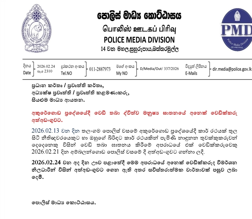 The suspected second gunman in the killing of a lawyer and his wife in Akuregoda has been arrested in the Uva Province, Police said in a statement. Investigations are ongoing. 2026-02-24