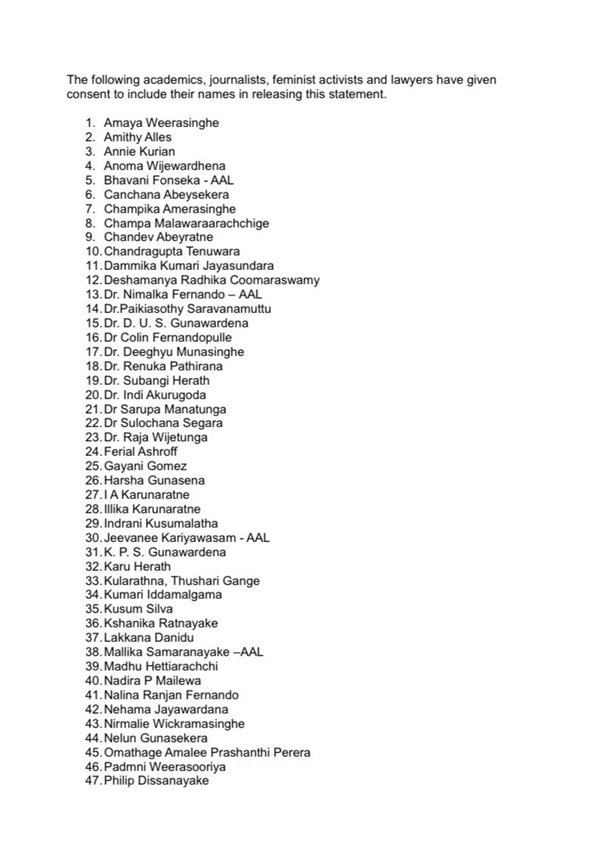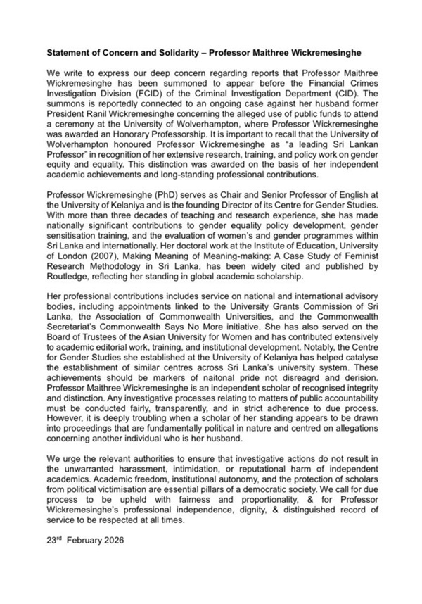 Signatories stressed that Professor Wickremesinghe is an independent scholar of recognised integrity and distinction, and warned that investigative processes must be conducted fairly, transparently, and in adherence to due process. They expressed concern that she appears to be drawn into proceedings that are political in nature and centred on allegations against her husband.