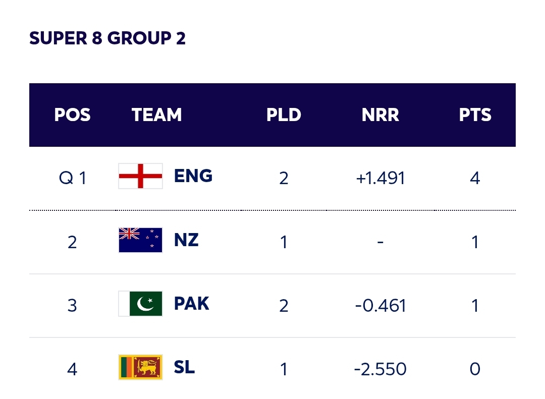 England’s win took them to four points from two matches, confirming their place in the semi-finals. Pakistan remain on one point from two games and must now rely on multiple favourable outcomes.