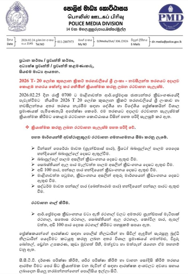 A special traffic plan will be in effect in Colombo for the ICC T20 World Cup 2026 match between Sri Lanka and New Zealand, scheduled at 7.00 pm at the R. Premadasa International Stadium in Colombo today.