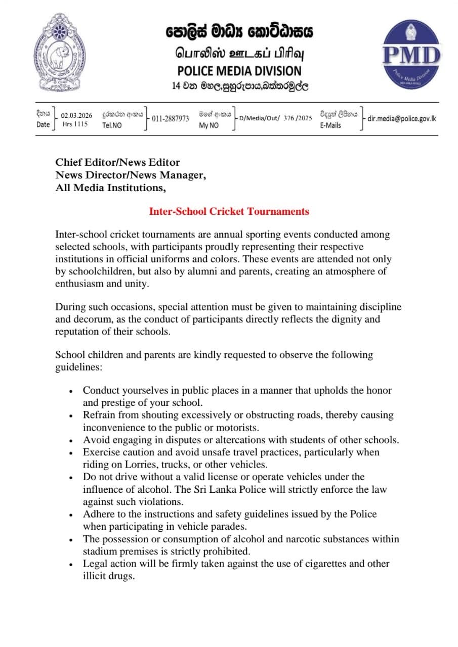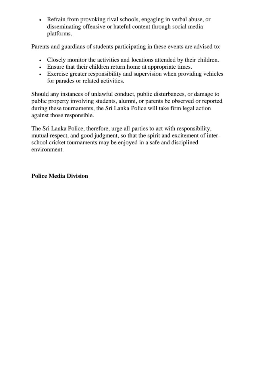 Sri Lanka Police have issued guidelines calling for discipline and safety during inter-school cricket big matches, which draw large crowds of students, parents and alumni.