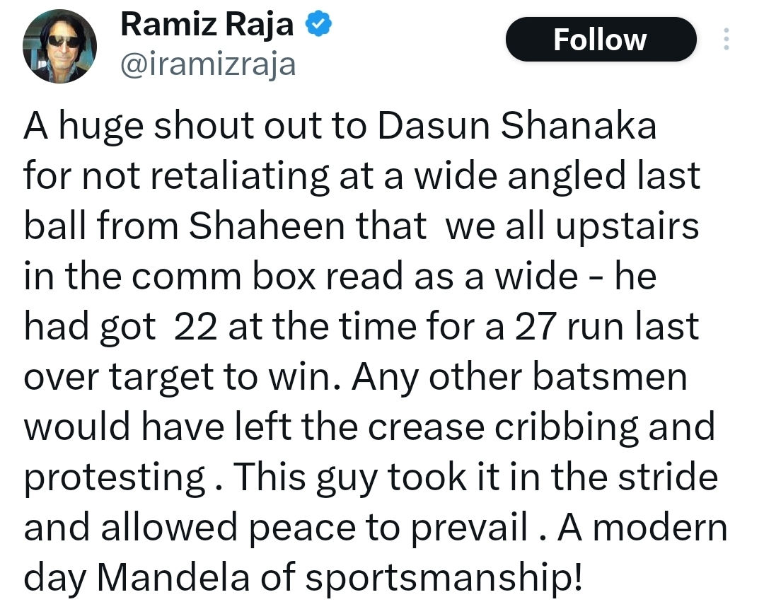 In a post on X, Raja commended Shanaka for not reacting to what appeared to be a wide delivery from Shaheen in the final over. He said those in the commentary box had read the ball as a wide, but Shanaka chose not to protest or show visible dissent.