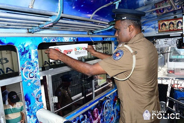 Led by several senior Police officers, Police personnel distributed awareness leaflets and displayed stickers on three‑wheelers around Bastion Mawatha, Fort, in Colombo.