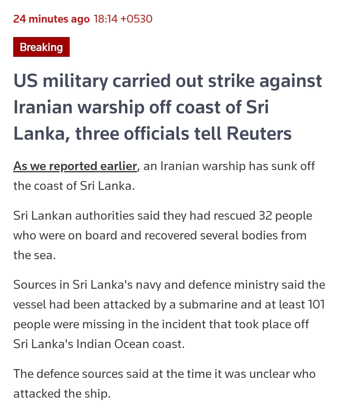 The US military carried out a strike against an Iranian warship off the coast of Sri Lanka, Reuters reports, citing three US officials. 2026-03-04
