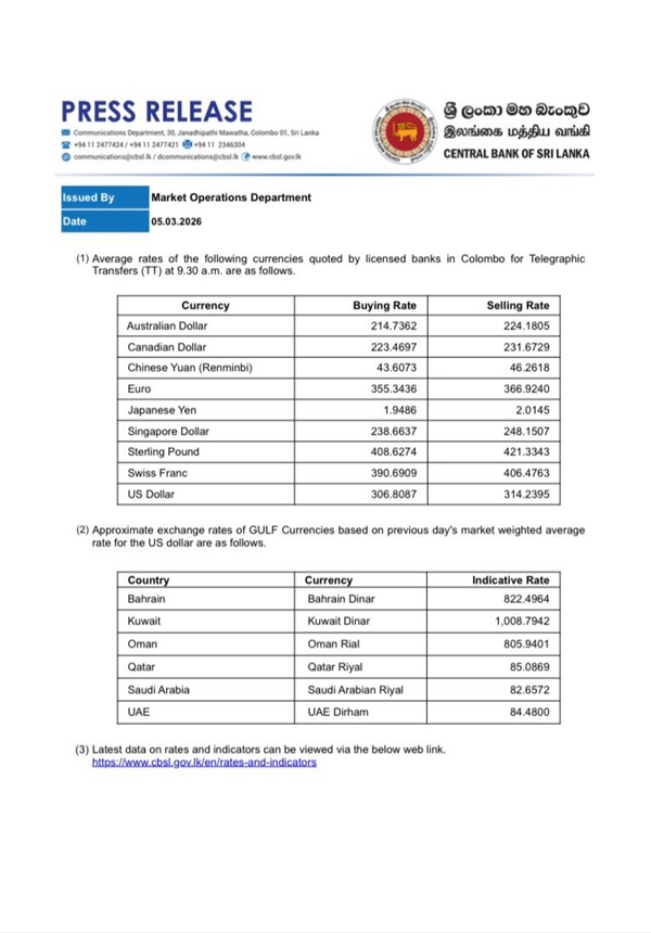 The Sri Lankan Rupee has depreciated further against the US Dollar today (05 March), compared to Wednesday.