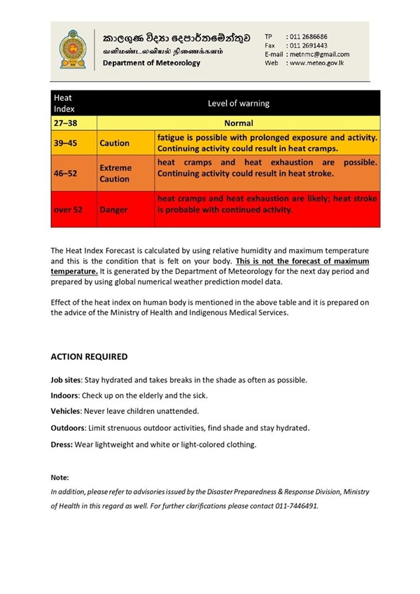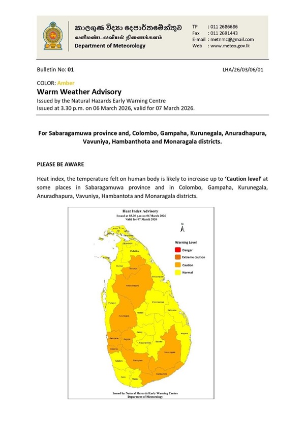 The Department of Meteorology has issued an advisory for warm weather in the Sabaragamuwa Province and in the Colombo, Gampaha, Kurunegala, Anuradhapura, Vavuniya, Hambantota and Monaragala districts.