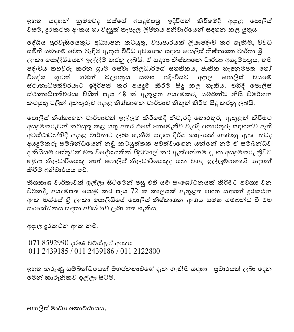 Police said applications can be submitted through the official Sri Lanka Police website at www.police.lk by accessing the E-Services section and selecting the Clearance Certificates service.