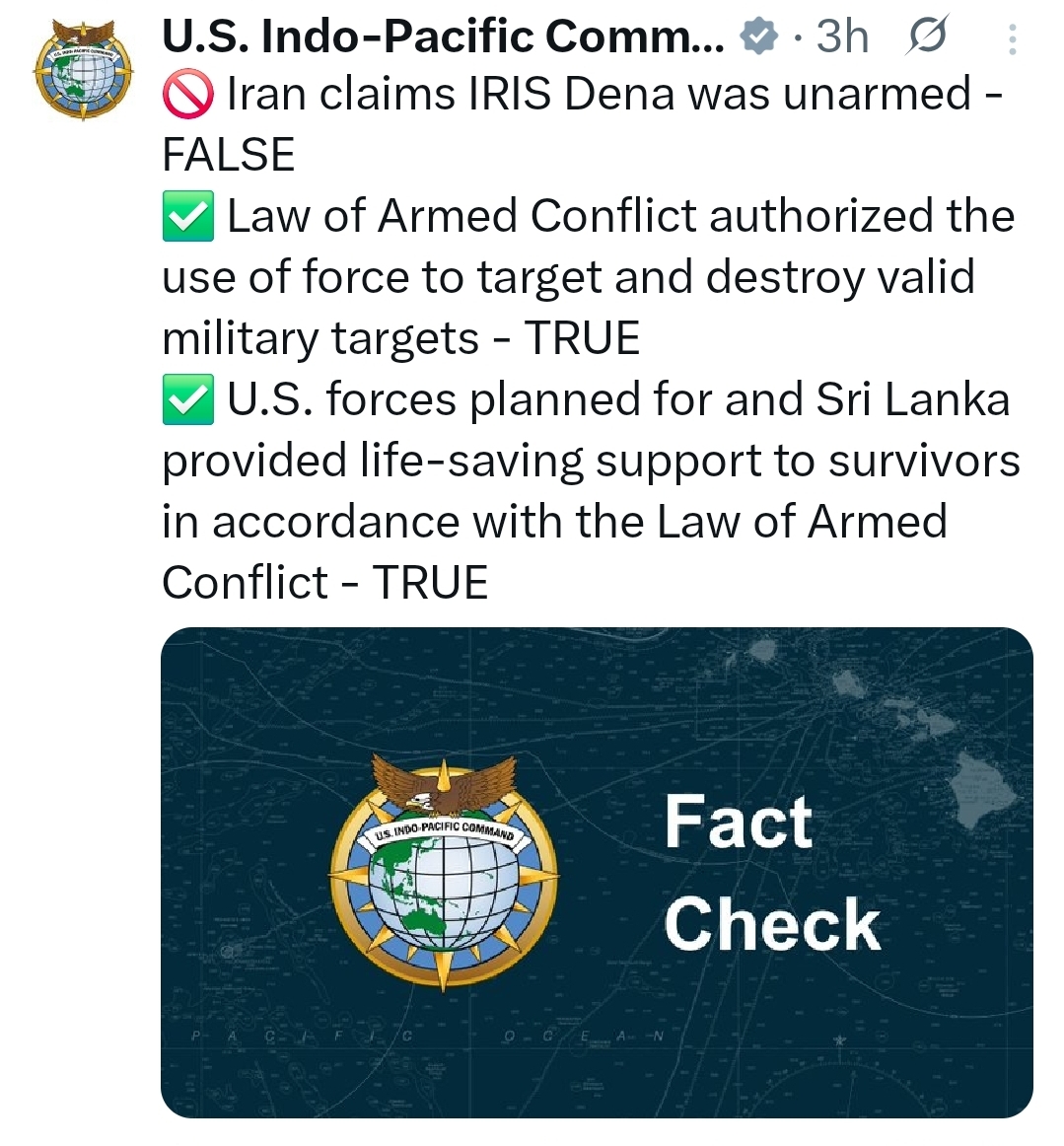 The U.S. Indo-Pacific Command has rejected Iran’s claim that the Iranian warship IRIS Dena was unarmed at the time it was attacked and sunk off the southern coast of Sri Lanka.