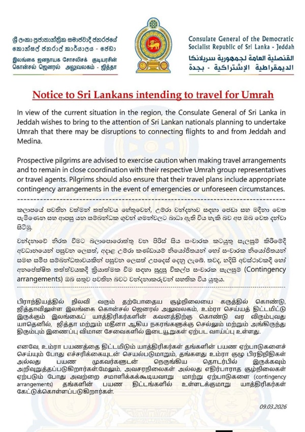 The Consulate General of Sri Lanka in Jeddah has cautioned Sri Lankan nationals planning to undertake Umrah that connecting flights to and from Jeddah and Medina may face disruptions due to the current situation in the region.