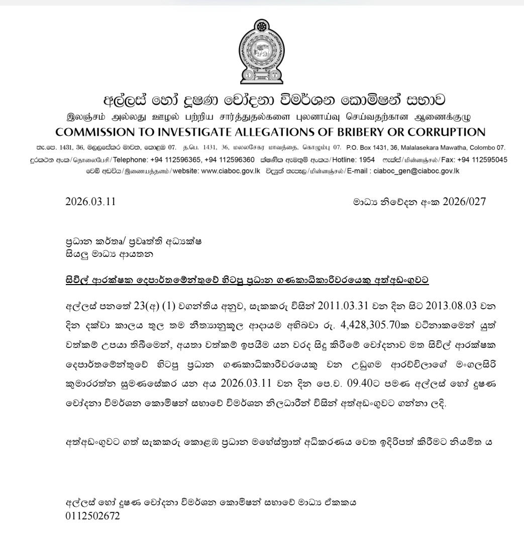 Former Civil Defence Chief Accountant Held Over Rs 4.4 Mn Illicit Assets Probe