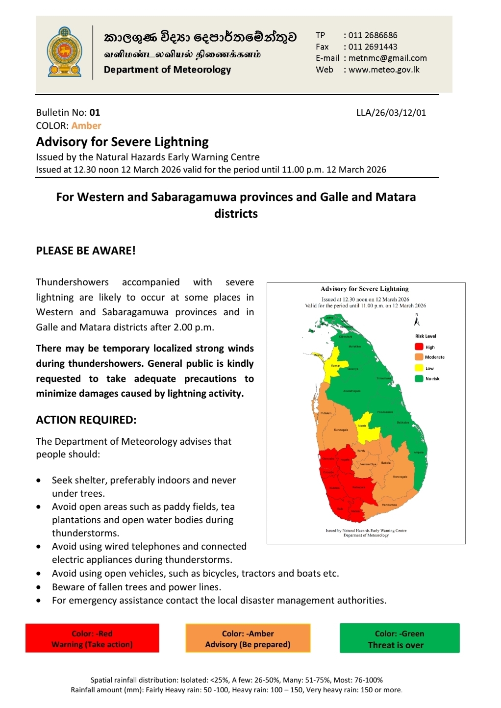 Thundershowers accompanied with severe lightning are likely to occur at some places in Western and Sabaragamuwa provinces and in Galle and Matara districts after 2.00 p.m.