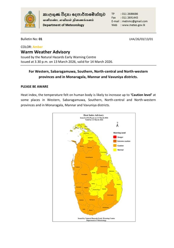 The Department of Meteorology has issued an advisory for warm weather in the Western, Sabaragamuwa, Southern, North-central and North-western provinces and the Monaragala, Mannar and Vavuniya districts.