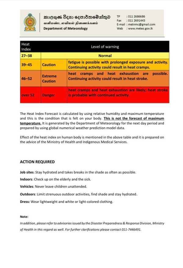Per the advisory, valid for tomorrow (14), the Heat Index, the temperature felt on the human body, is likely to increase up to ‘Caution level’ at some places in 15 districts.