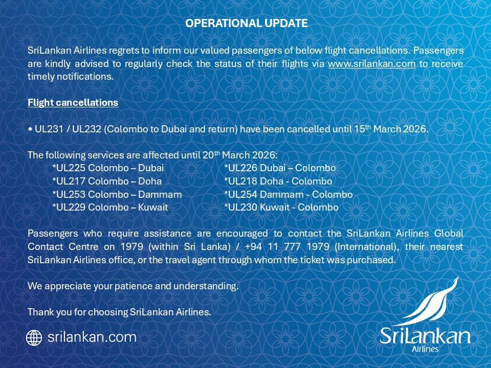 Flights UL231 and UL232, operating between Colombo and Dubai, will remain cancelled until 15 March 2026. In addition, the airline has cancelled the following services until 20 March 2026: