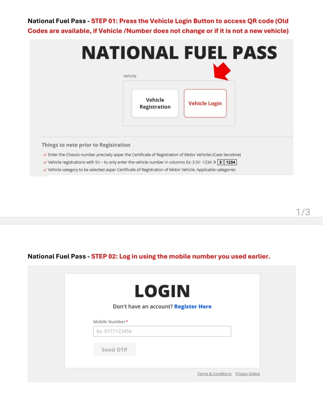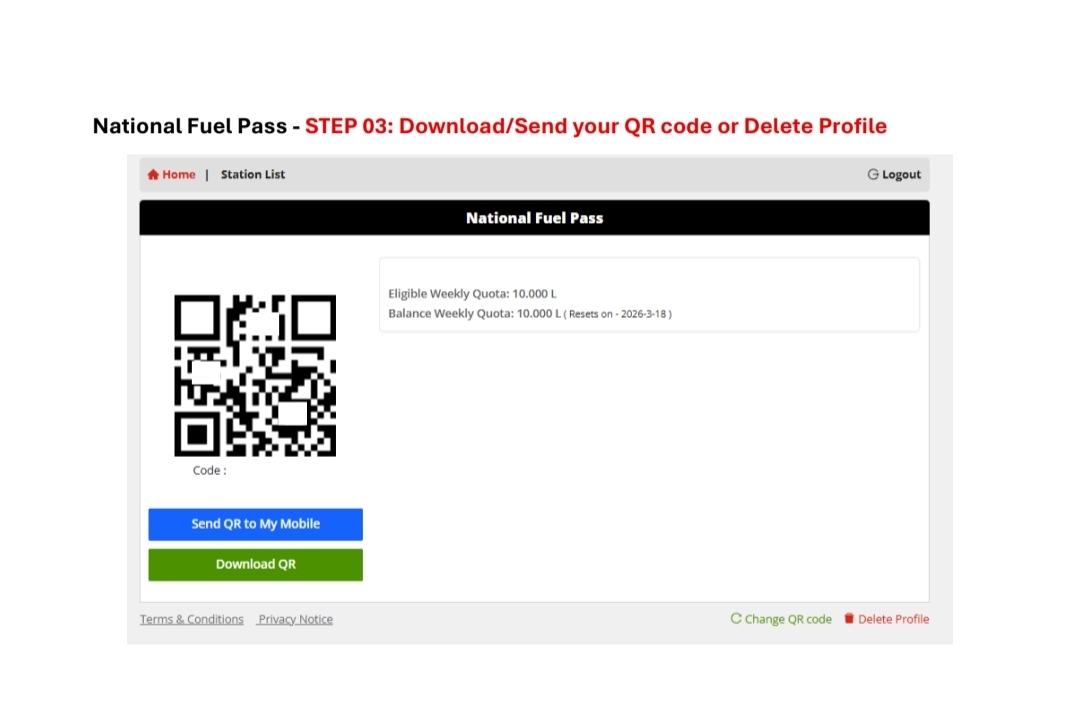 To register for a Fuel Pass, visit http://fuelpass.gov.lk and follow the registration process, after which a unique Fuel Pass in the form of a QR code will be displayed – which can be saved on a mobile device or printed to be produced at fuel outlets