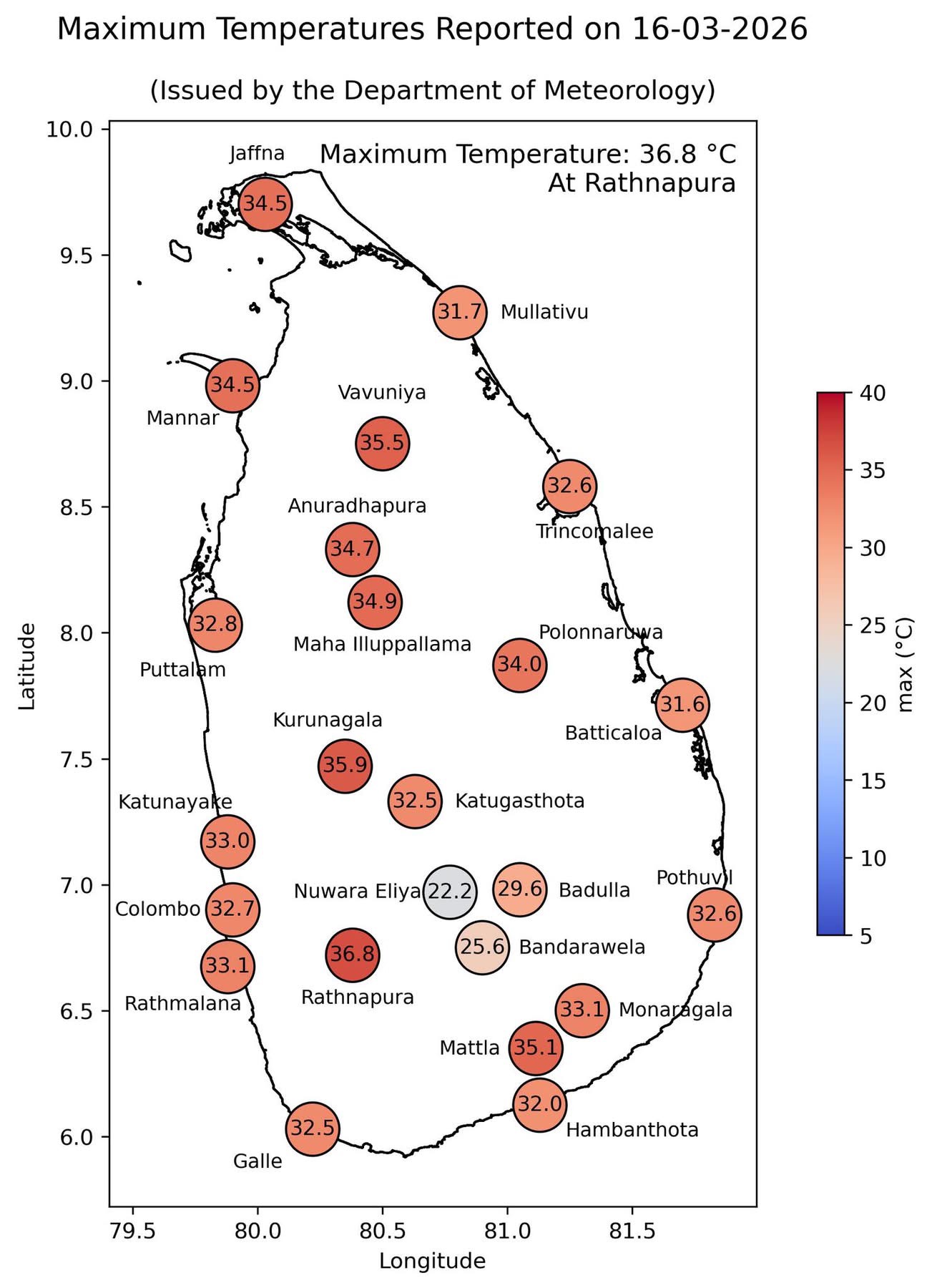 Ratnapura recorded the highest temperature in the country today, Monday(16), reaching 36.8 degrees Celsius, according to the Department of Meteorology.