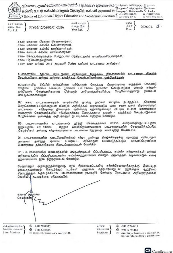 The Ministry of Education has announced a set of special guidelines to ensure the smooth continuation of daily administration and teaching–learning activities in schools while managing energy consumption during the ongoing fuel supply issue.