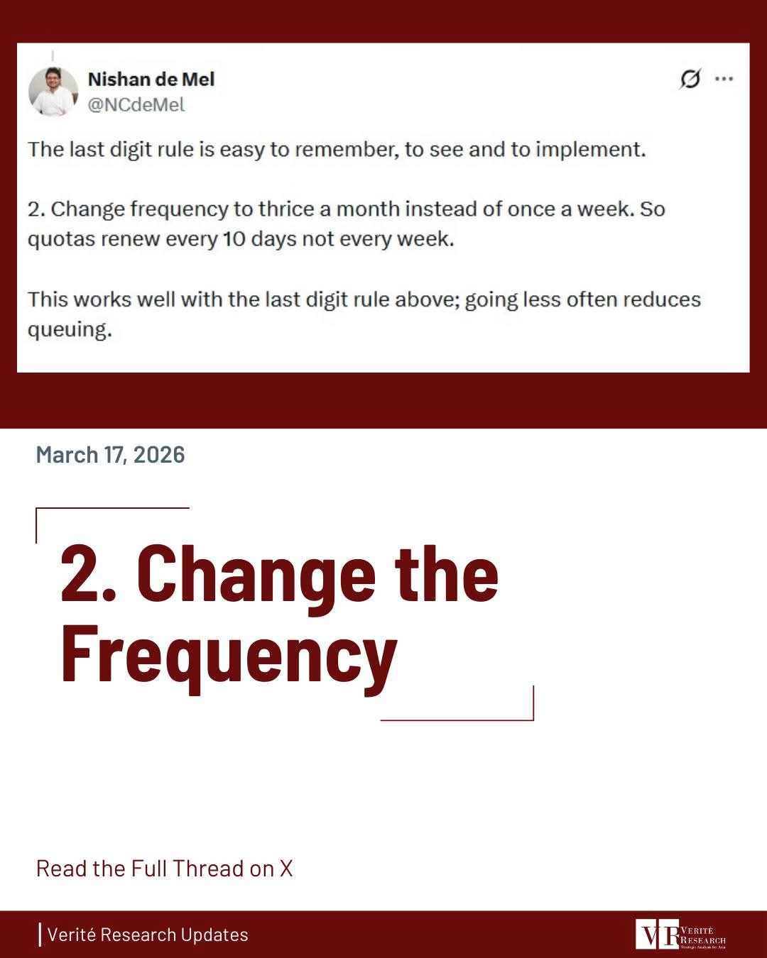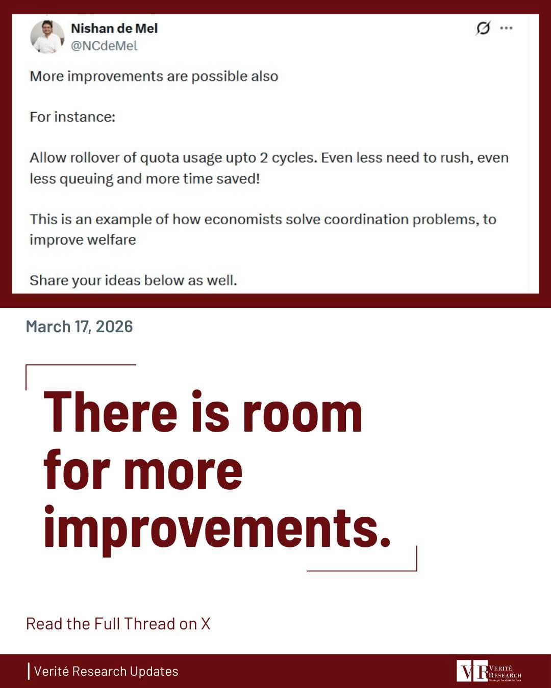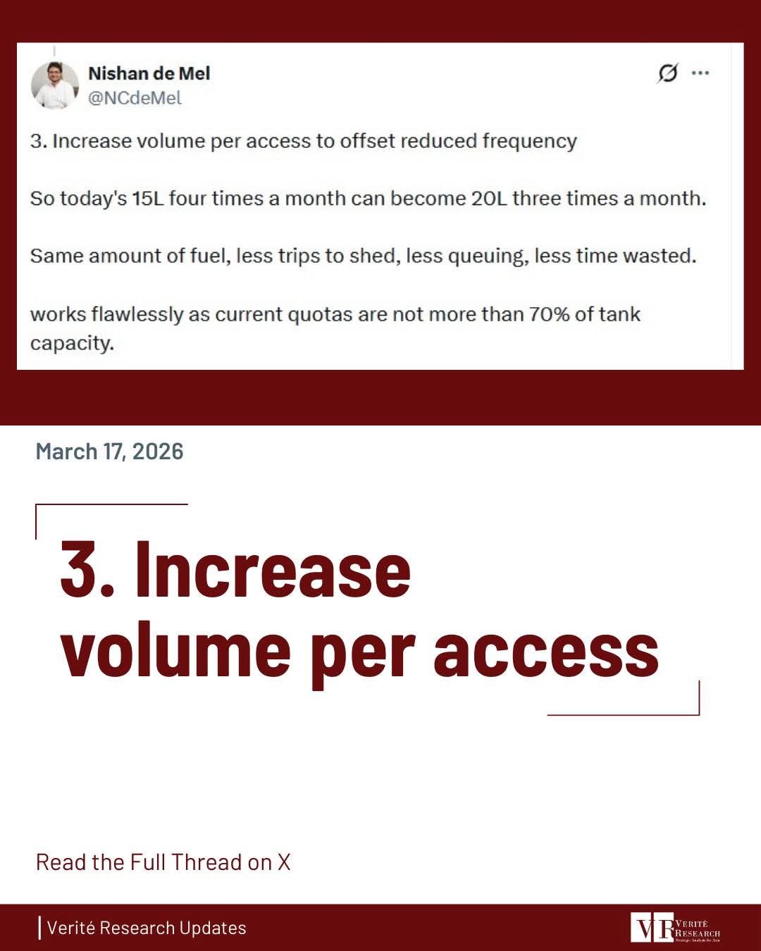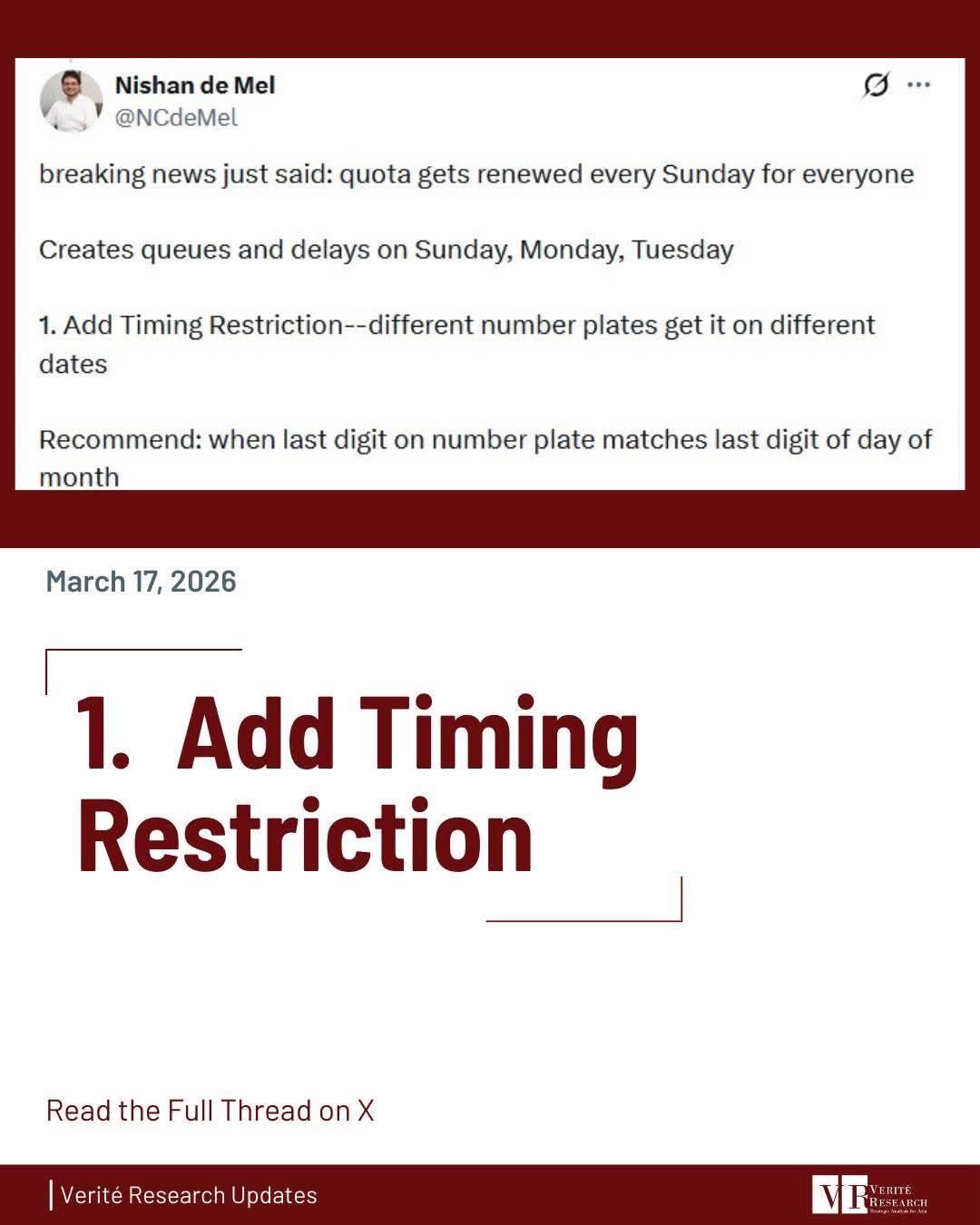 Dr. Nishan de Mel, Executive Director of Verité Research, has proposed three practical measures to reduce fuel queues and save time, while maintaining the current total fuel allocation.