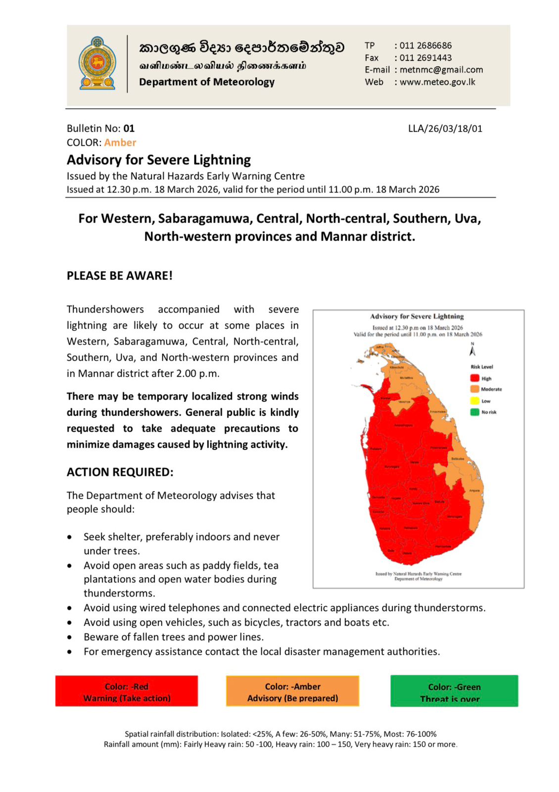 The Department of Meteorology has issued an amber advisory warning of severe lightning across several provinces, valid until 11.00 p.m. today.