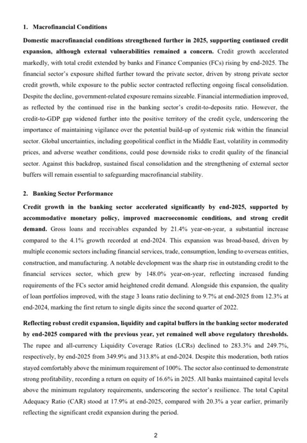 Sri Lanka’s domestic macrofinancial conditions strengthened further in 2025, supporting continued credit expansion, though external vulnerabilities remained a concern, according to the Central Bank of Sri Lanka (CBSL).