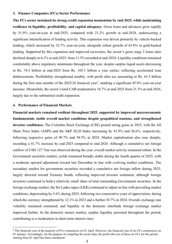 Financial markets remained resilient in 2025, supported by stronger fundamentals and investor confidence. The Colombo Stock Exchange posted gains, with the All Share Price Index rising 41.9% and the S&P SL20 up 26.6%. Market capitalisation increased by 41.7% compared to 2024. Government securities yields remained broadly stable, while foreign inflows into Treasury bonds reflected improved sentiment. The Sri Lankan rupee depreciated by 5.6% in 2025 after two years of appreciation, though exchange rate volatility was contained and interbank forex liquidity improved. Surplus liquidity in the domestic money market contributed to moderating short‑term interest rates. (Newswire)