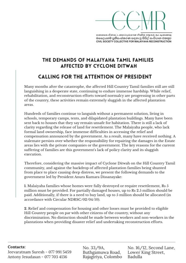 The Civil Society Collective for Malaiyaha Reconstruction has presented a 15‑point set of demands to President Anura Kumara Dissanayake, urging urgent action to address the plight of Hill Country Tamil families affected by Cyclone Ditwah.
