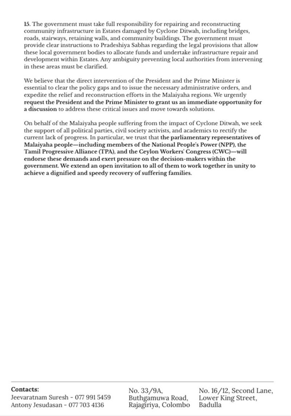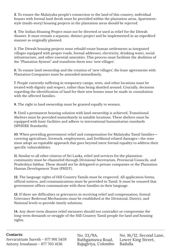 The group also calls for women’s equal land rights, Tamil language accessibility in official communications, and government responsibility for repairing damaged estate infrastructure.