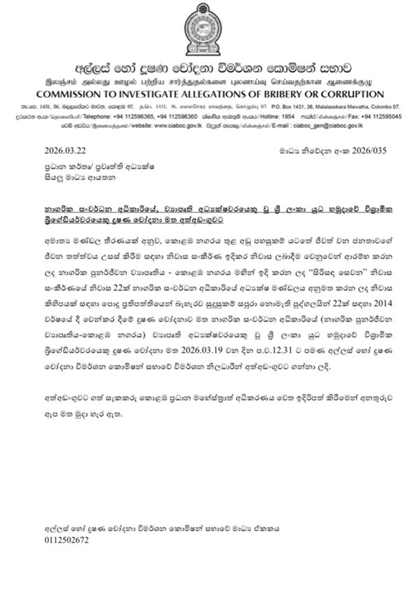 According to the Bribery Commission, 22 apartments at the “Sirisanda Sevana” housing complex, constructed under a Cabinet‑approved initiative to uplift the living standards of low‑income residents in Colombo, were allocated in 2014 to individuals who did not meet eligibility requirements.