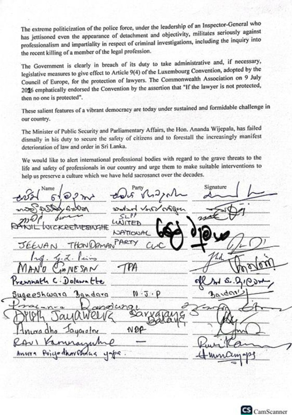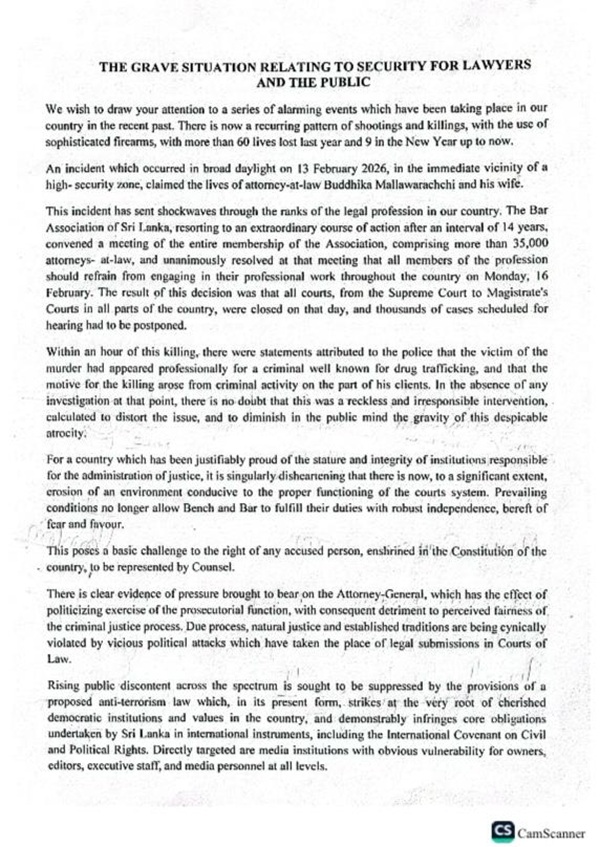 This incident has sent shockwaves through the ranks of the legal profession in our country. The Bar Association of Sri Lanka, resorting to an extraordinary course of action after an interval of 14 years, convened a meeting of the entire membership of the Association, comprising more than 3,500 attorneys-at-law, and unanimously resolved at that meeting that all members of the profession should refrain from engaging in their professional work throughout the country on Monday, 16 February. The result of this decision was that all courts, from the Supreme Court to Magistrate’s Courts in all parts of the country, were closed on that day, and thousands of cases scheduled for hearing had to be postponed, they said.