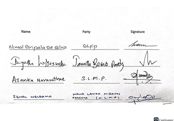 The letter was signed by Opposition members, including Sajith Premadasa (SJB), Ranil Wickremesinghe (UNP), Namal Rajapaksa (SLPP), Jeewan Thondaman (CWC), Nimal Siripala De Silva (SLFP), Mano Ganesan (TPA), Dilith Jayaweera (Sravajana Balaya), and others.