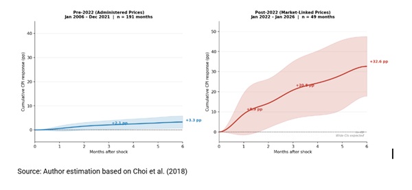 However, the CPI is far more responsive under market-linked pricing. Oil price shocks now translate into significantly higher CPI inflation within months. The estimated response shows a steady increase over time, indicating that global energy price movements are now transmitted more directly into domestic inflation.