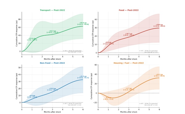 Non-food prices, including manufactured goods, retail services, and other consumer items, show a more gradual but persistent increase. This reflects second-round effects as businesses across the economy begin to pass higher transport and energy costs into the prices of goods and services. The response of housing, electricity, and fuel-related utilities estimates a temporary dip before prices begin to rise more steadily. This may reflect an institutional feature of how these prices are set, where prices, particularly electricity tariffs and liquid petroleum gas (LPG) prices, are revised periodically rather than continuously. As a result, there can be a lag between increases in global oil prices and price adjustments. The initial dip should not be interpreted as a true reduction in underlying costs but likely a particularly delayed tariff adjustment in the data, statistical noise in the early months of the shock, or a new pricing mechanism. As adjustments take place, the upward pressure becomes more visible over time.