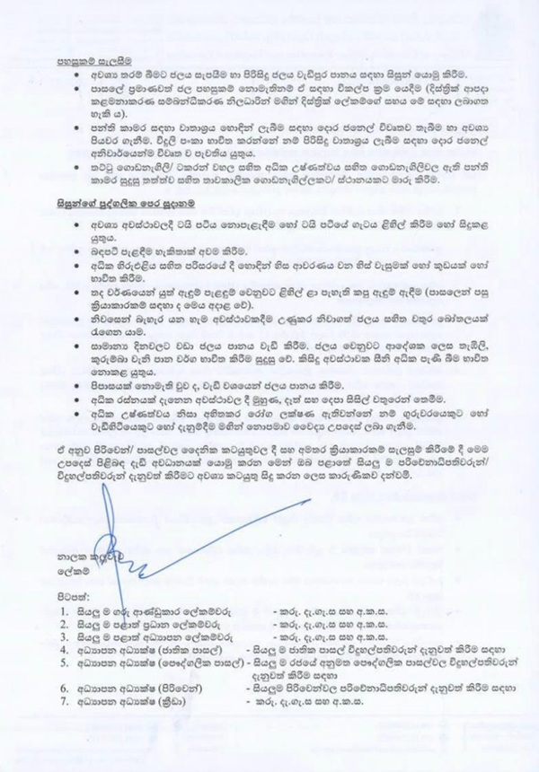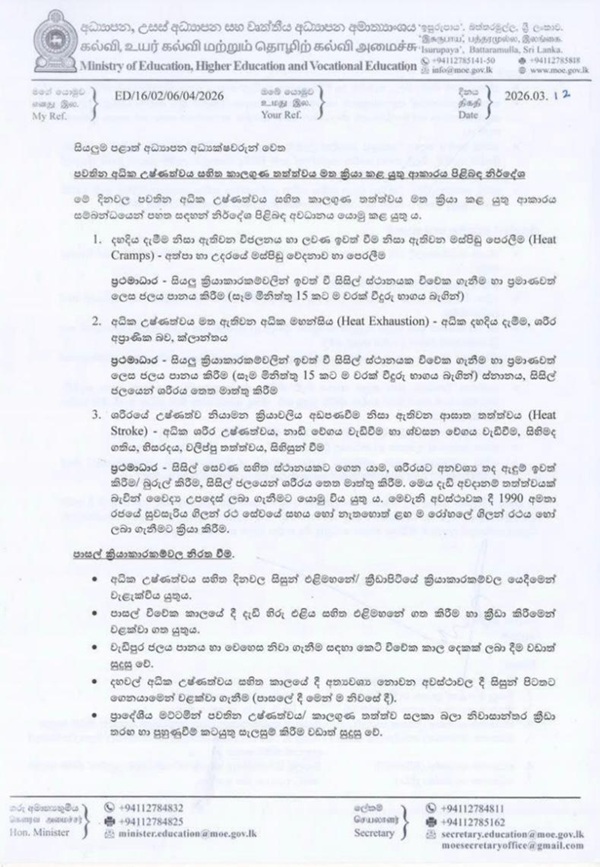 The Ministry of Education, Higher Education and Vocational Education has instructed all schools and zonal education directors to strictly adhere to the guidelines issued in response to the prevailing extreme heat conditions across Sri Lanka.