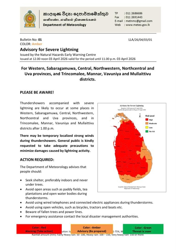 The Department of Meteorology has issued an advisory for severe lightning in the Western, Sabaragamuwa, Central, Northwestern, Northcentral, and Uva provinces, and the Trincomalee, Mannar, Vavuniya and Mullaittivu districts today (03).
