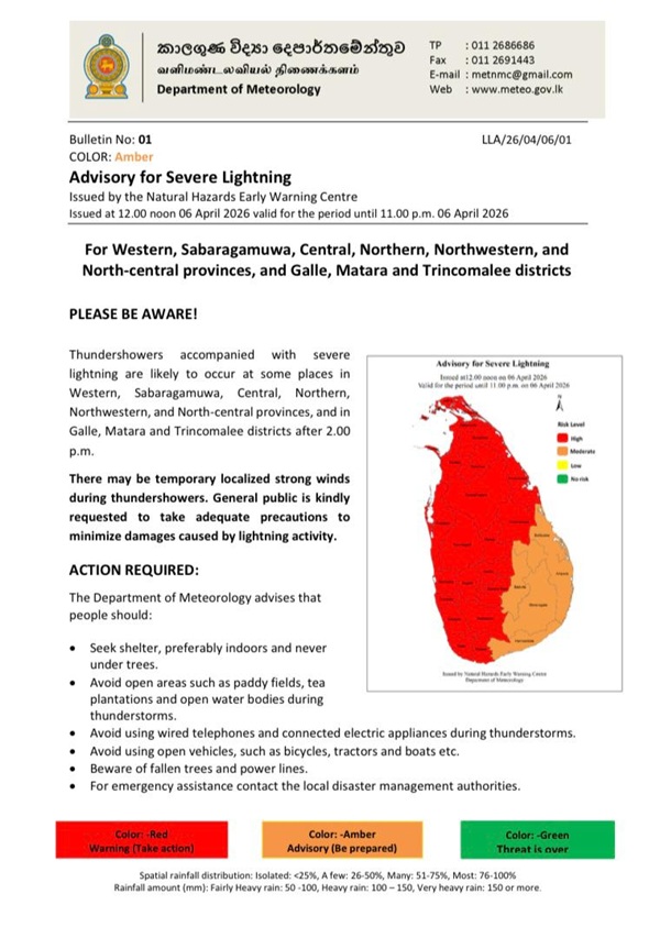 The Department of Meteorology has issued an advisory for severe lightning in the Western, Sabaragamuwa, Central, Northern, Northwestern, and North-central provinces, and the Galle, Matara and Trincomalee districts.