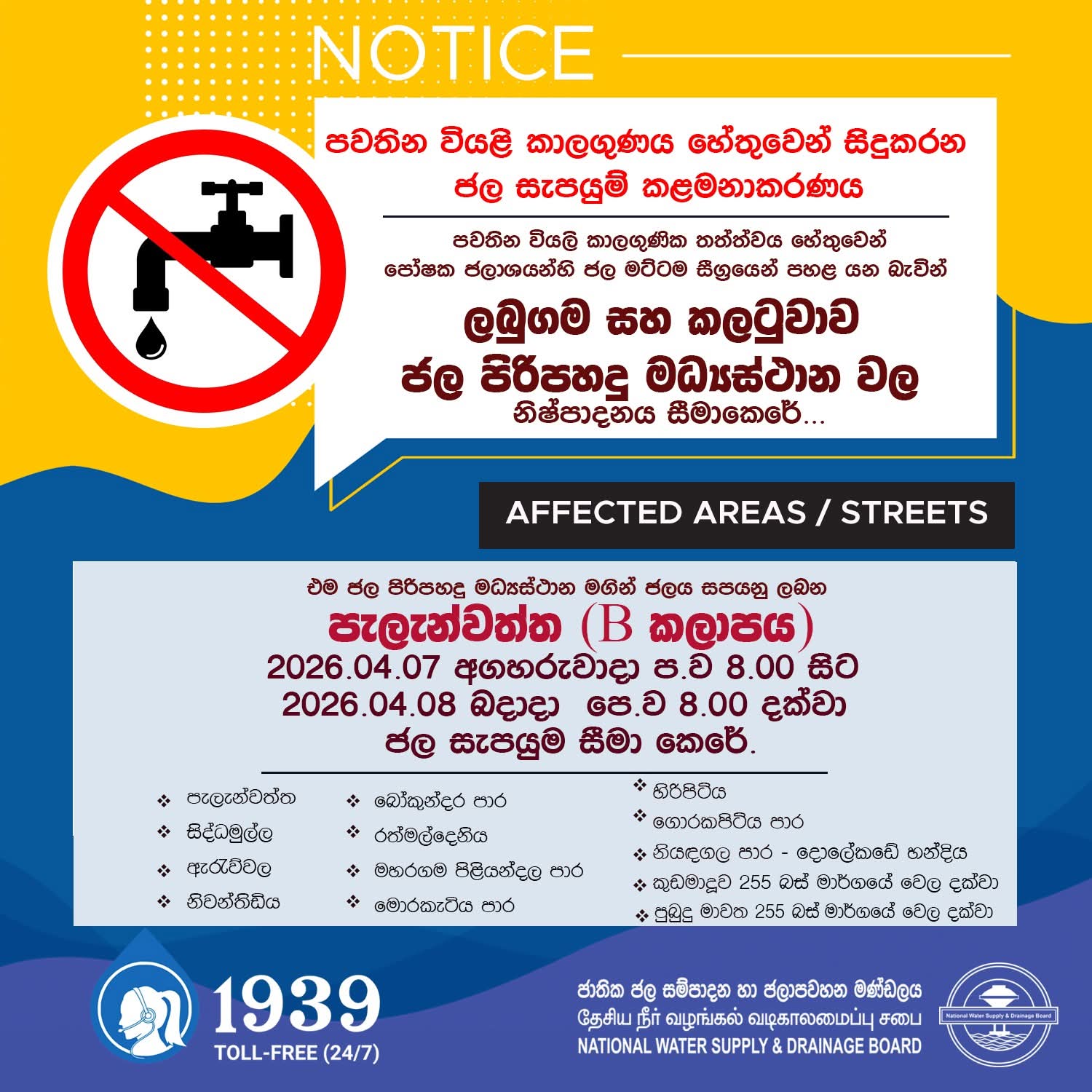 Accordingly, water supply in Palanwatta (Zone B) will be limited from 8.00 p.m. on Tuesday (07) until 8.00 a.m. on Wednesday (08).